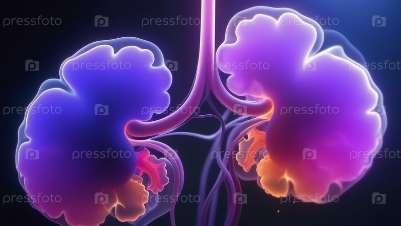 Светящаяся анатомическая иллюстрация почек человека на темном фоне