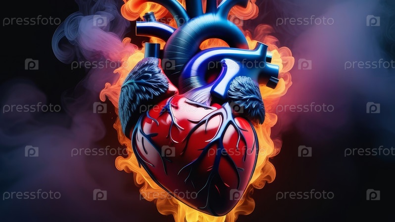 Яркое красное анатомическое сердце с огненным фоном