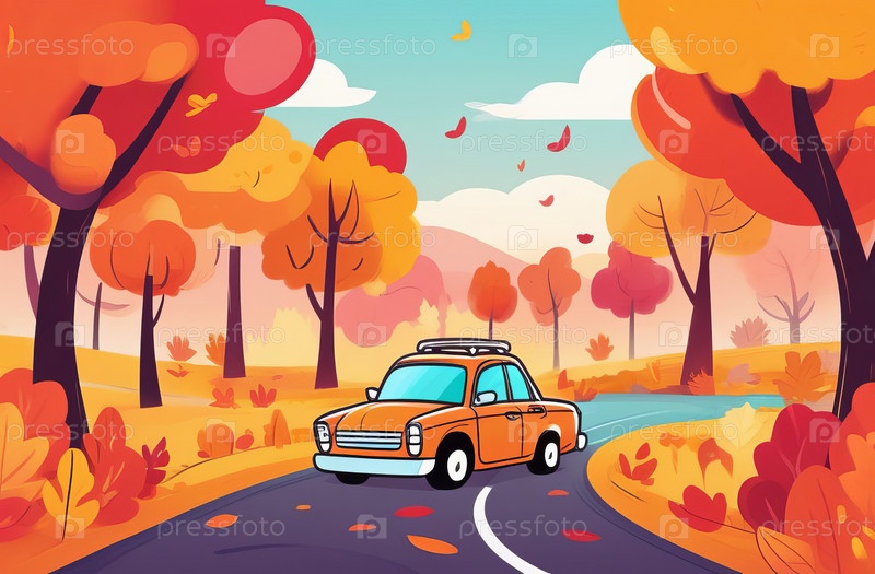 Оранжевый автомобиль проезжает через осенний лес с разноцветными деревьями