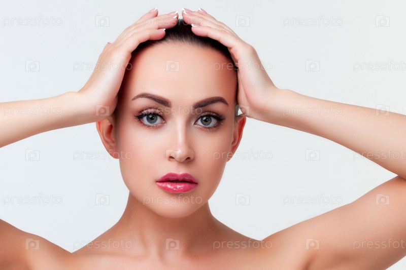 Портрет красоты молодой женщины в полотенце после душа. белый фон