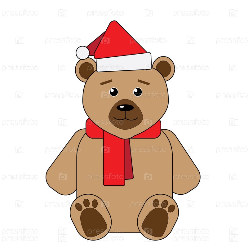 Милый бурый медведь в красной рождественской шапке и шарфе. Изолированные на белом фоне