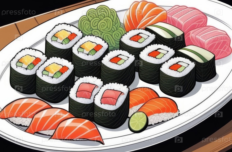 Иллюстрация различных суши-роллов и сашими на подносе, вид сверху