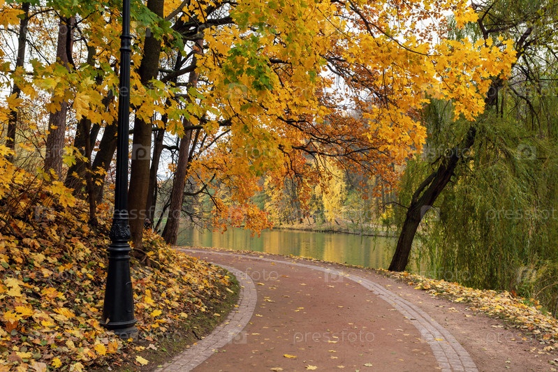 Прогулочная дорожка в осеннем парке вдоль берега пруда
