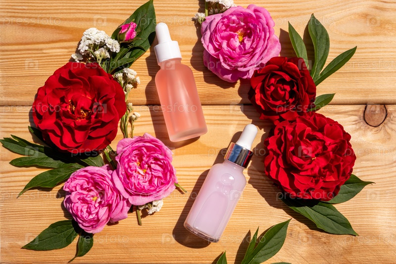 Две матовые бутылки-капельницы с натуральным средством по уходу за лицом и телом на деревянном фоне среди роз. Концепция ухода и красоты. натуральная косметика