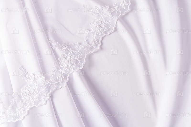 Часть красивой белой кружевной тюлевой ткани или часть свадебного платья невесты на белом атласном фоне. место для текста. Дизайн-макет