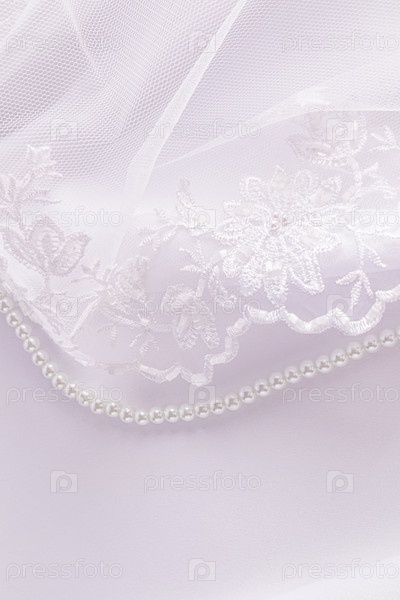 Нежный абстрактный свадебный фон из белого атласа, вышитой фаты, тюля и нити жемчужных бус. Макет, открытка, приглашение, обои
