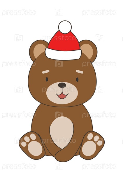 Бурый медведь в красной шапке на белом фоне