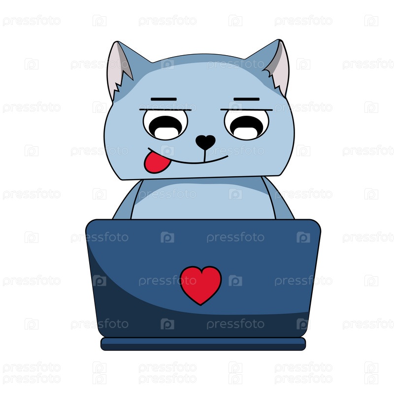 Забавный мультяшный синий кот, работающий на ноутбуке