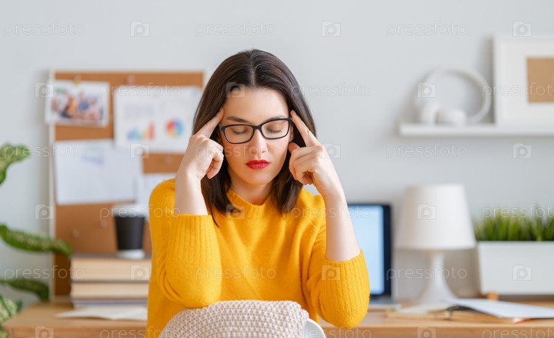 Молодая женщина учится и у нее болит голова