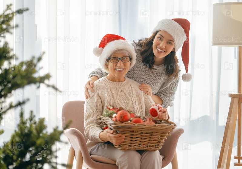Семья украшает елку