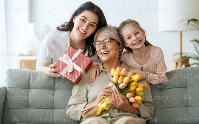 Ребенок, мама и бабушка с цветами