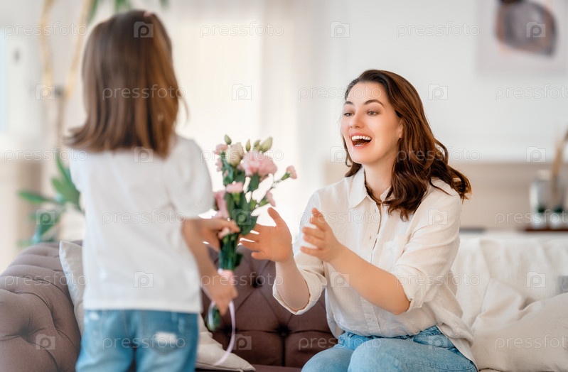 Дочь дарит матери букет цветов