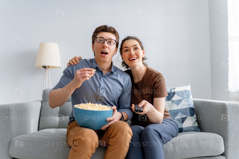 Пара с попкорном сидит на диване