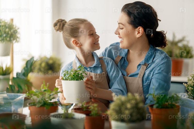Семья ухаживает за растениями