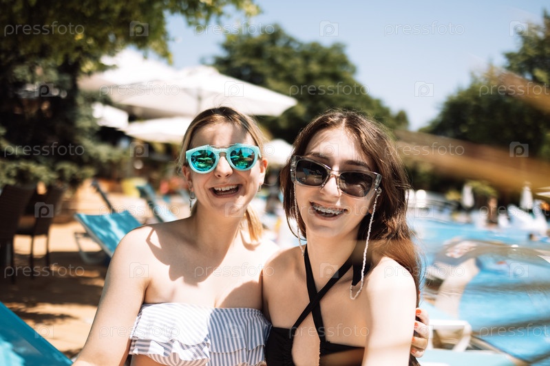 Два симпатичных подростка в купальниках смеются в бассейне. Улыбающиеся подруги в солнцезащитных очках отдыхают в отпуске