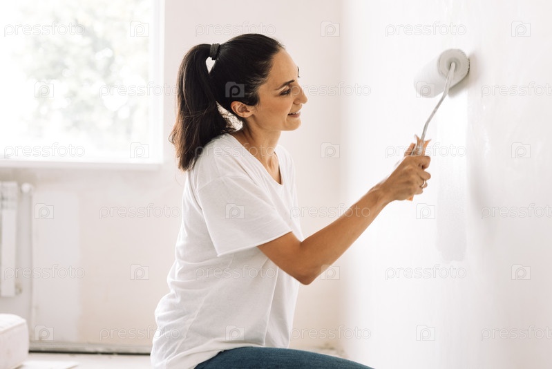 Смеющаяся молодая женщина в футболке красит стену в доме в белый цвет