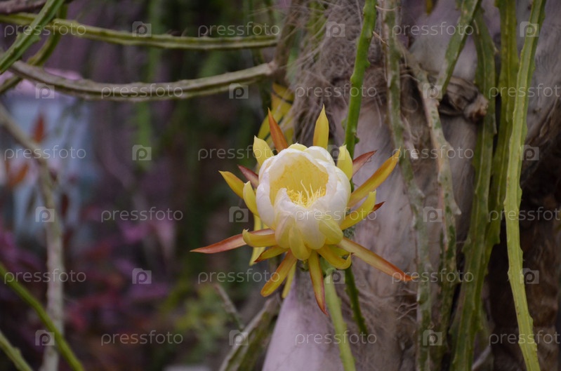 Цветение Селеницереус крючкообразный, кружевчатый (лат. Selenicereus hamatus, царица ночи хаматус, семья кактусов) в Ботаническом саду Петра Великого, Санкт-Петербург