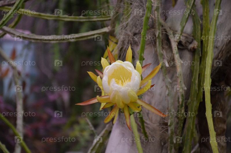 Цветение Селеницереус крючкообразный, кружевчатый (лат. Selenicereus hamatus, царица ночи хаматус, семья кактусов) в Ботаническом саду Петра Великого, Санкт-Петербург