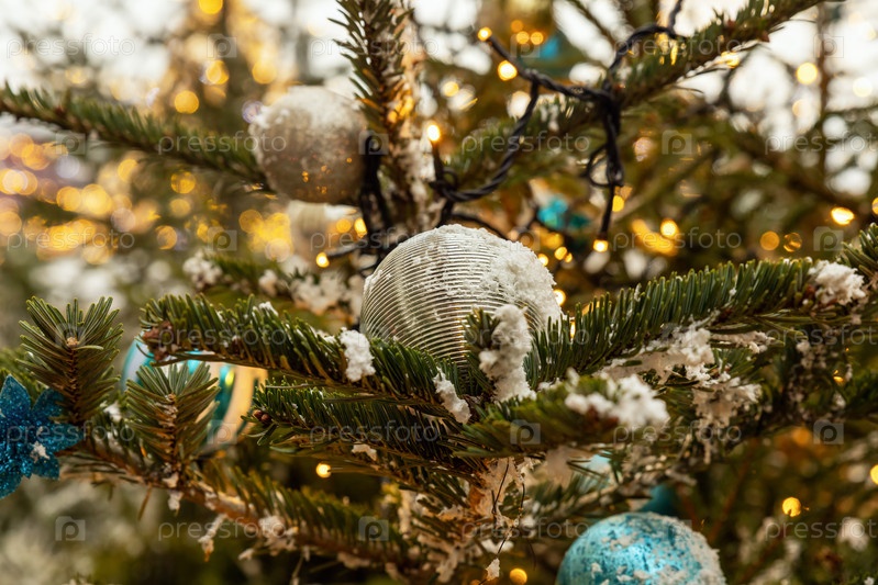 Украшенная новогодняя елка с огнями боке на заднем плане