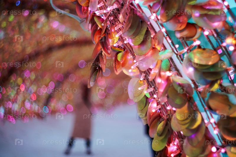 Рождественские декорации на улице , украшенная разноцветными гирляндами. Размытый фон