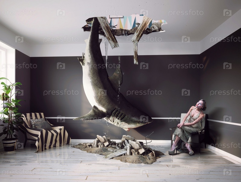 3D-рендеринг современного интерьера гостиной с большой акулой, ломающей пол