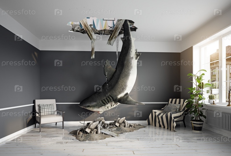 Современный интерьер гостиной с большой акулой