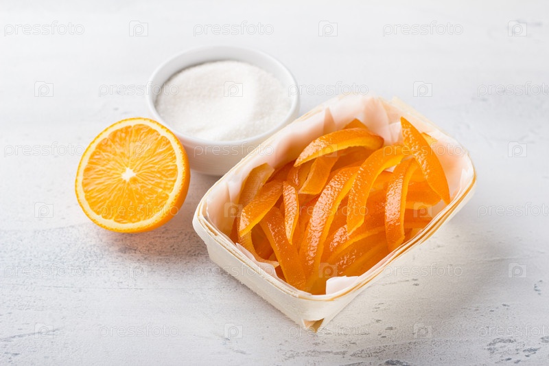 Плетеная березовая корзина со свежими сочными засахаренными апельсинами со свежим сочным апельсином и сахаром на светло-сером фоне
