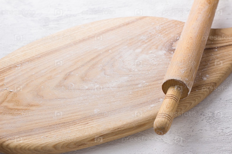 Деревянная доска, посыпанная мукой и скалкой на светло-сером фоне