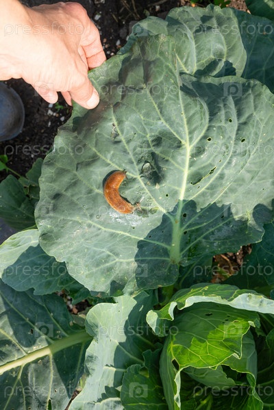 Детальный крупный план коричневого слизняка, лежащего на большом зеленом листе с рукой рядом с ним