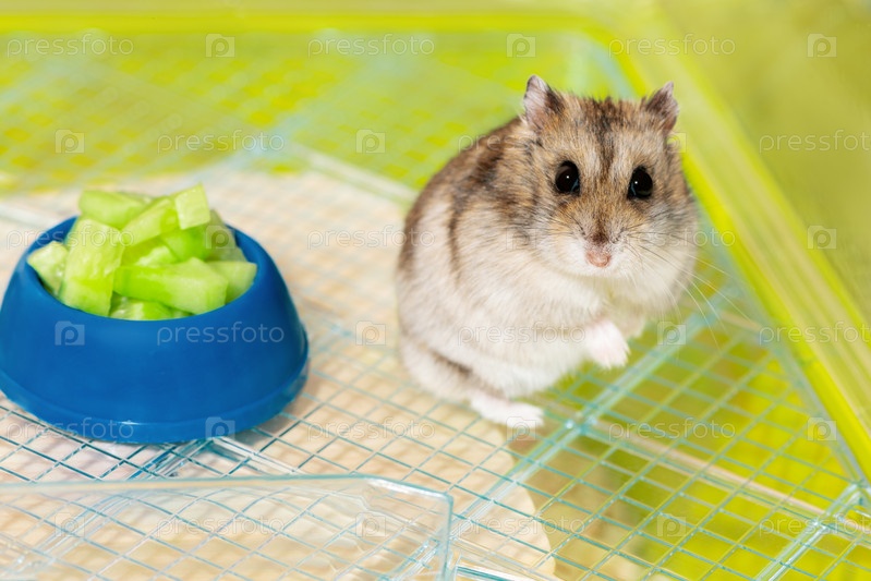 Карликовый хомяк и миска со свежими продуктами в клетке. Милый хомяк стоит на задних лапах. Карликовый хомяк и миска с свежими овощами в камере. Милый грызун стоит на задних лапах