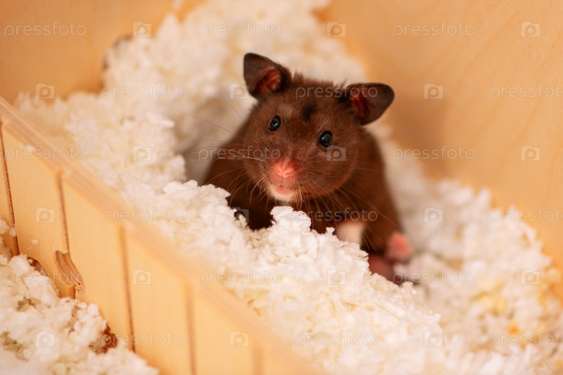 Сирийский хомяк сидит на бумажной стружке в деревянном доме. Сирийский хомяк сидит на бумажном наполнителе в деревянном доме. Милый грызун работает в камере