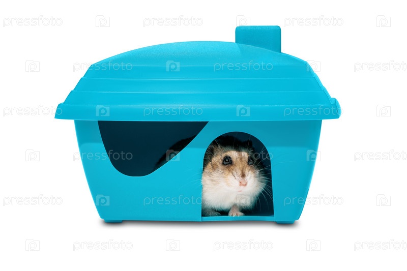 Дом грызунов на белом фоне. Джунгарский хомяк выглядывает из пластикового домика. Домик для грызунов на белом фоне. Джунгарский хомяк стоит у норы и любимцы из домика