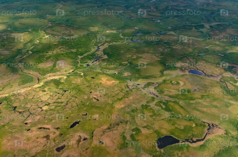 Арктическая тундра летом с высоты 2000 метров. Разнообразие цветов и пейзажей. Просторы первозданной природы. Тень от облаков