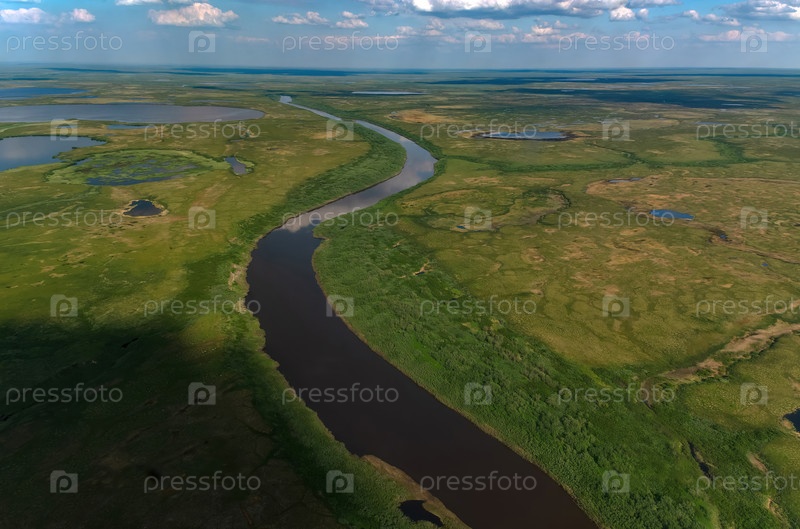 Арктическая тундра летом с высоты 2000 метров. Облачное небо. Разнообразие цветов и пейзажей. Просторы первозданной природы. Тень от облаков
