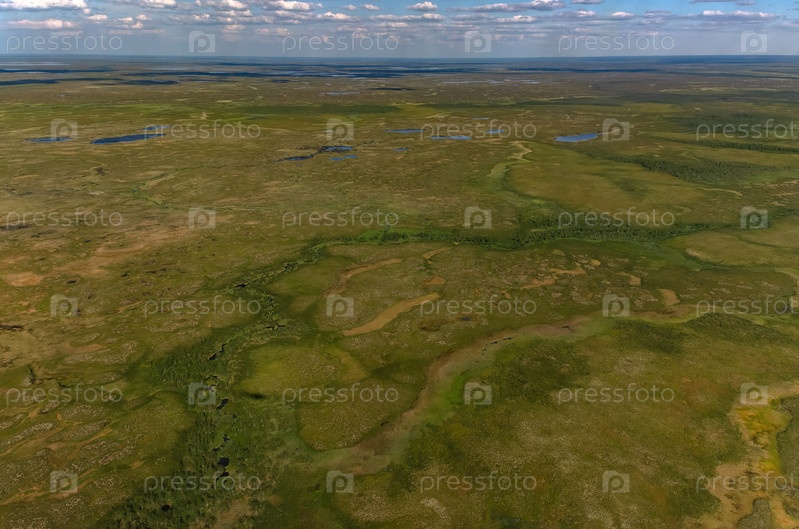 Арктическая тундра летом с высоты 2000 метров. Облачное небо. Разнообразие цветов и пейзажей. Просторы первозданной природы. Тень от облаков