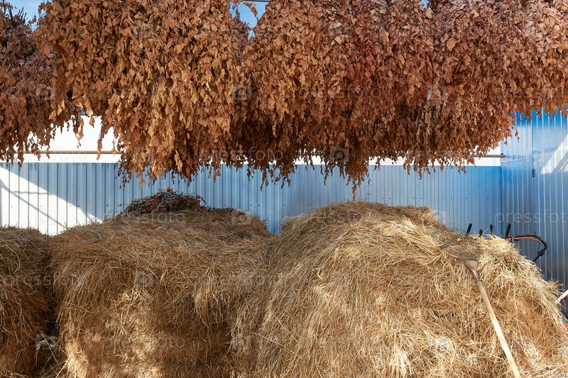 Куча сена и веники из веток у голубого забора
