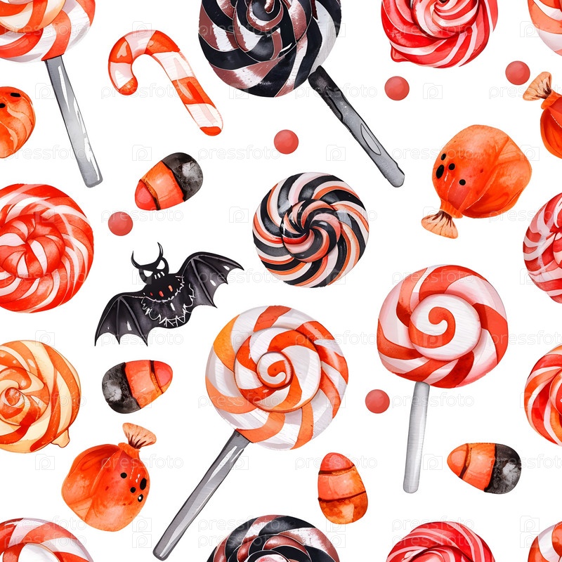 Акварель праздничный Хэллоуин бесшовный узор с нарисованными вручную сладостями и угощениями на белом фоне. Вихревые леденцы, леденцы, спиральные конфеты, жевательные шарики