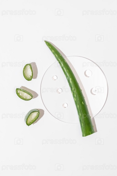 Стеклянная чашка Петри с каплями геля алоэ для лица и листом растения алоэ вера. экстракт трав. косметическая продукция. Научная дерматологическая косметическая лаборатория