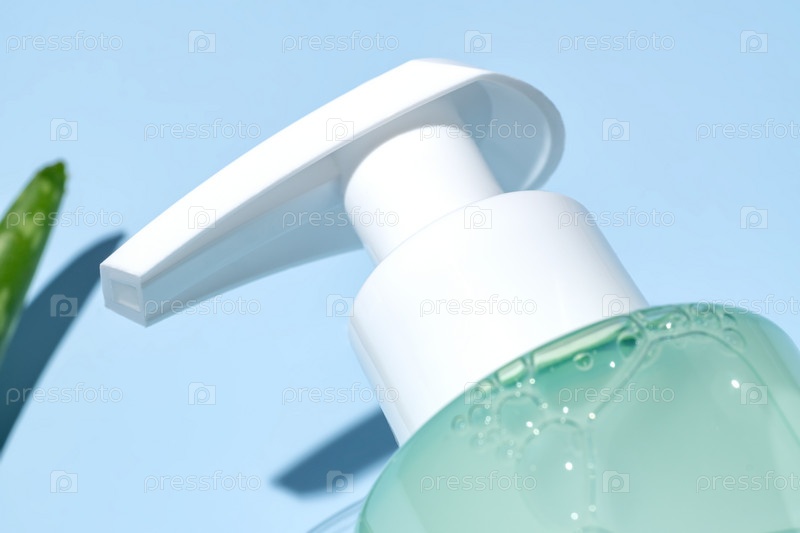 Крупный план помпы с очищающим средством для лица алоэ вера на синем фоне. Косметическая упаковка для мыла, шампуня или кондиционера. Витрина