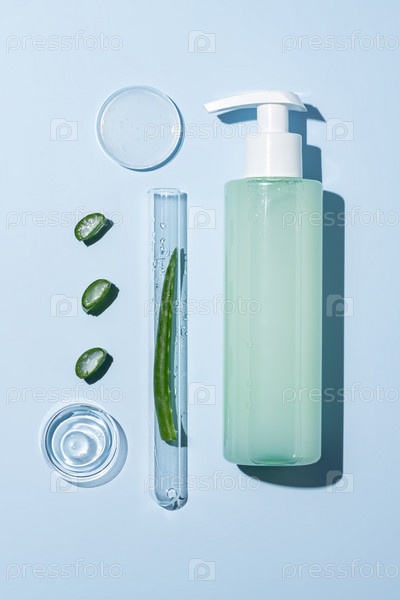 Чашка Петри с гелем Алоэ вера и мылом, надетая бутылочка с насосом без маркировки, стакан с гелем Алоэ вера. Макет упаковки шампуня, очищающего средства, кондиционера для косметики с экстрактом алоэ вера