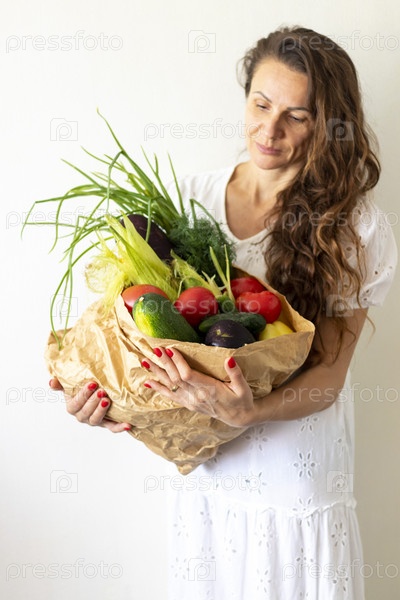 Снимок женщины, держащей бумажный пакет со свежими травами и овощами. Стиль жизни