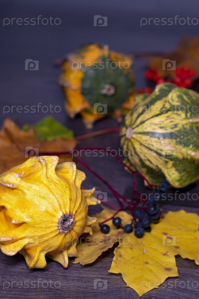 Осенний натюрморт с декоративной желтой тыквой на переднем плане, с опавшими листьями, тыквами, ягодами на заднем плане на черном фоне. Крупный план