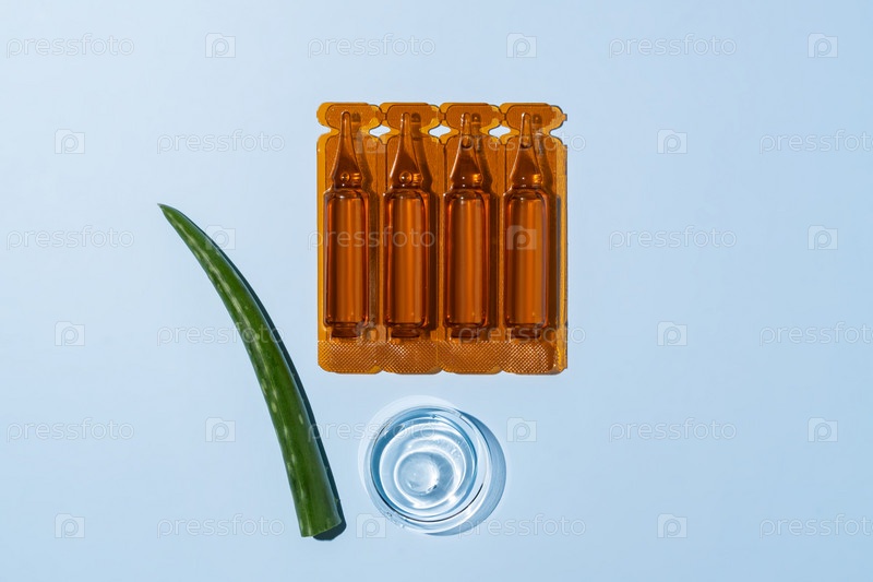 Ампулы с экстрактом алоэ вера для ухода за кожей или волосами. Успокаивающее средство для нежной кожи. образец геля алоэ в чашке Петри на синем фоне