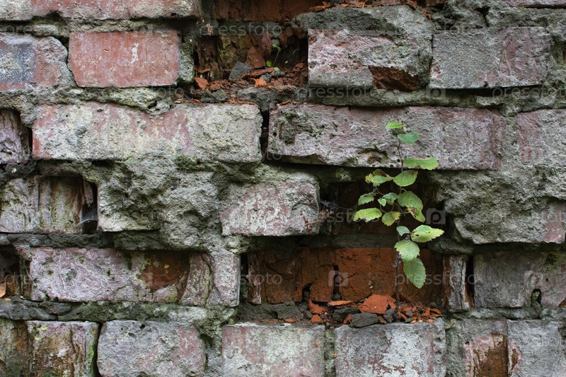 Старая кирпичная кладка. Фрагмент разрушающейся стены с ростком дерева и мхом. Текстурированное фоновое изображение