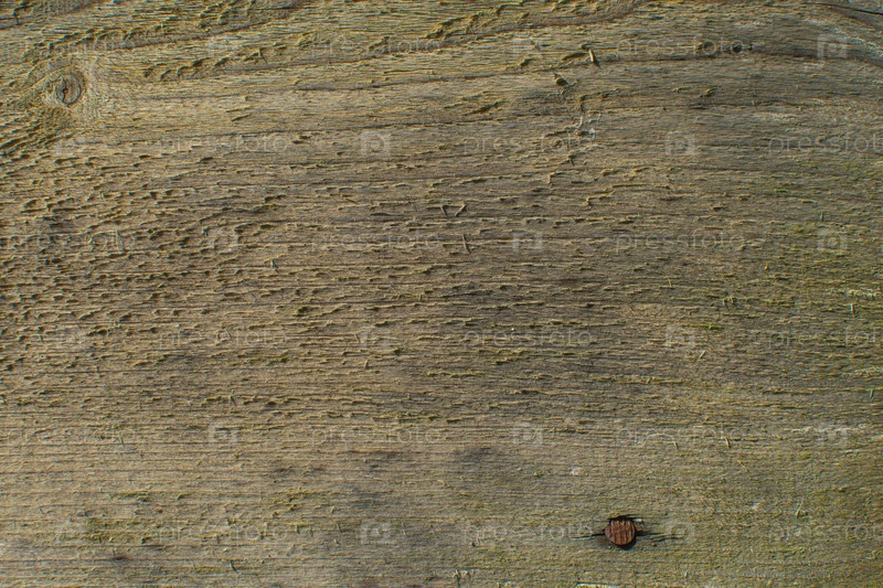Фрагмент грубой фактурной деревянной доски с шляпкой гвоздя. Изображение на заднем плане. Крупный план