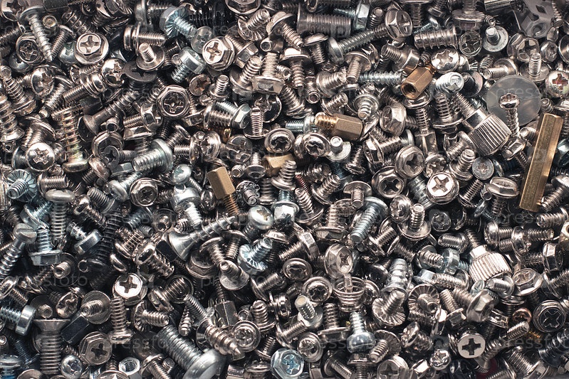 Куча винтиков. Компьютерные крепления. Вид сверху. Текстурированное изображение. Цветное изображение