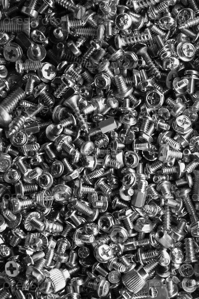 Промышленный эскиз. Куча винтиков. Компьютерные крепления. Вид сверху. Текстурированное изображение. Черно-белое изображение