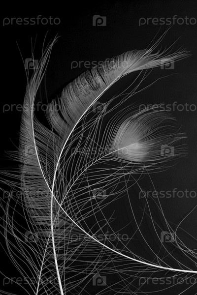 Фрагменты трех больших скрещенных белых птичьих перьев крупным планом, изолированные на черном фоне. Абстрактное вертикальное изображение