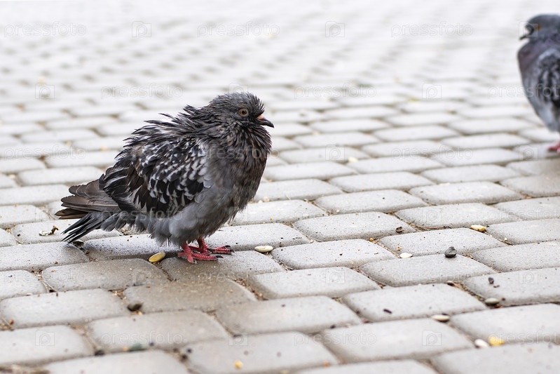 Растрепанный мокрый голубь в ненастную погоду на фоне тротуарной плитки. Горизонтальная фотография