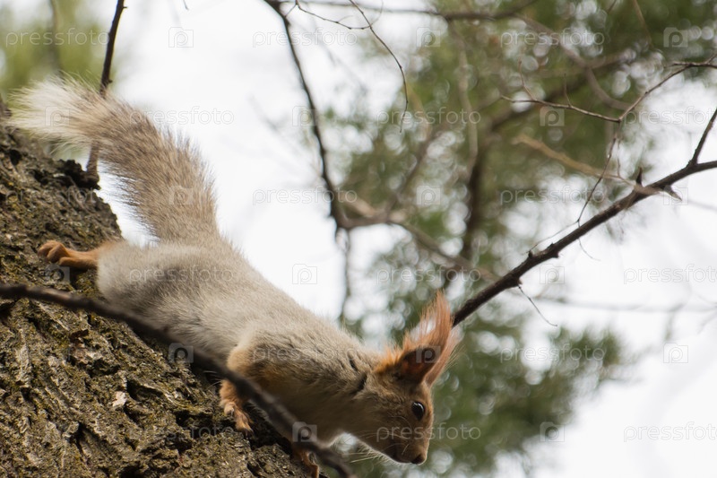 Серая белка лазит по голым деревьям весной